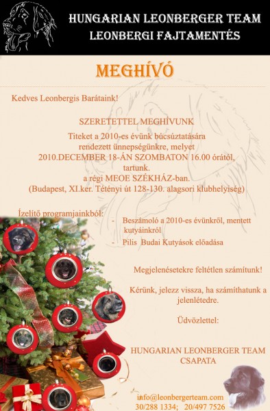 2010. december 18-án 16.00-tĂłl a rĂ©gi MEOE SzĂ©kház KlubhelyisĂ©gĂ©ben (Budapest XI. ker TĂ©tĂ©nyi Ăşt 128-130) tartjuk ÉvzárĂł ĂĽnnepsĂ©gĂĽnket, melyre szeretettel meghĂvunk TĂ©ged Ă©s Családod!